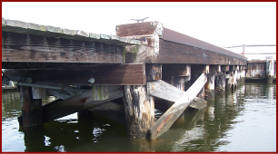 MPP engineers performed a condition assessment of two existing piers at the former Naval Reserve Training Center in Perth Amboy, NJ. The purpose of our investigation was to determine the current condition of the structures and evaluate them for future adaptive reuse as part of a 49 acre waterfront redevelopment project. One of the piers consisted of steel H-piles supporting cast in place concrete beams and precast plank. The other pier was constructed of timber piles and timber beams supporting a combination of timber decking and cast in place concrete slab over corrugated metal decking.